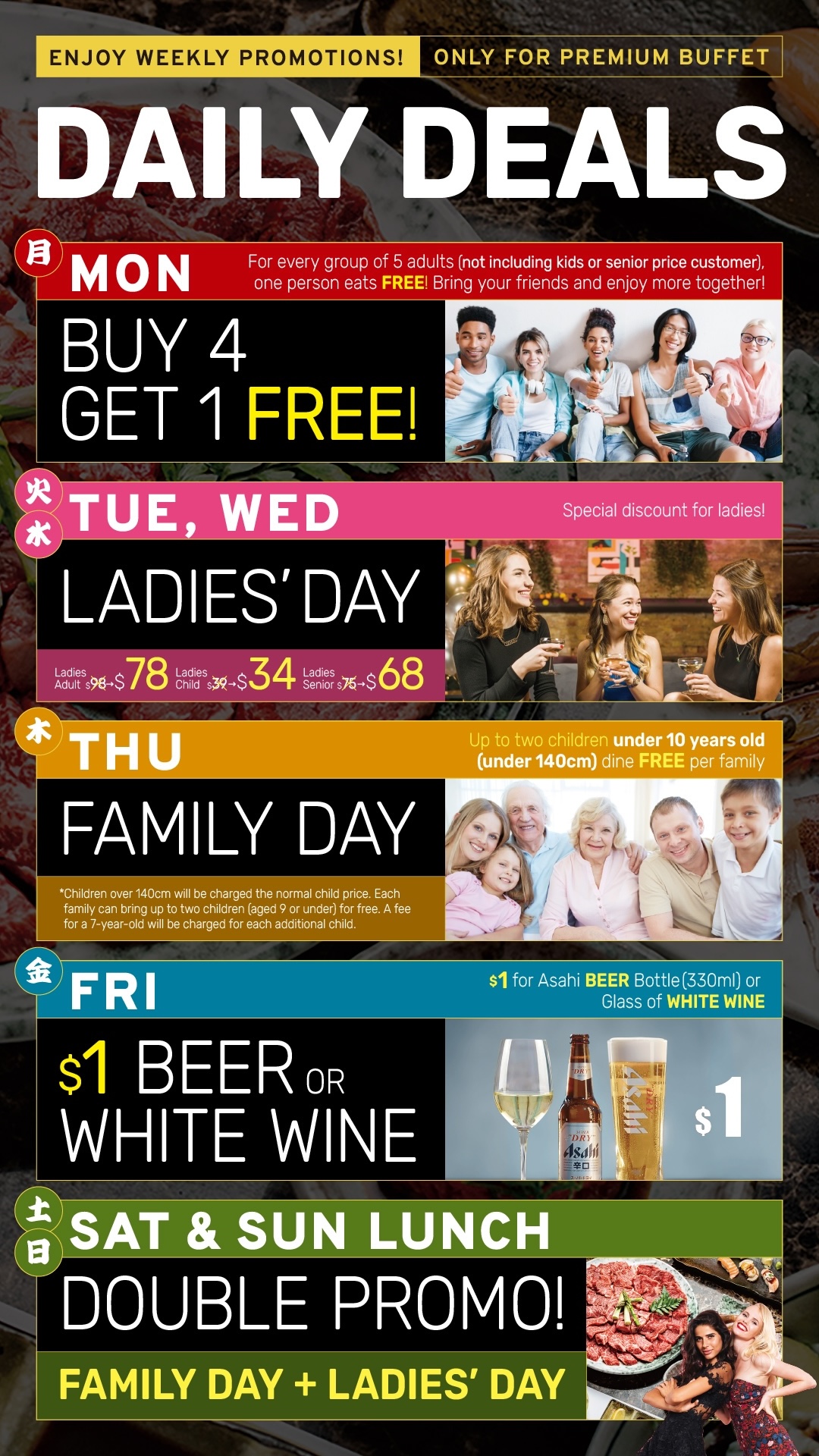 On Friday and Saturday, the time slots for standard buffet are 5:30pm, 5:45pm and after 8:00pm. Please note that if you make a booking for Premium Buffet($98), you cannot order Standard Buffet($58) at the restaurant.